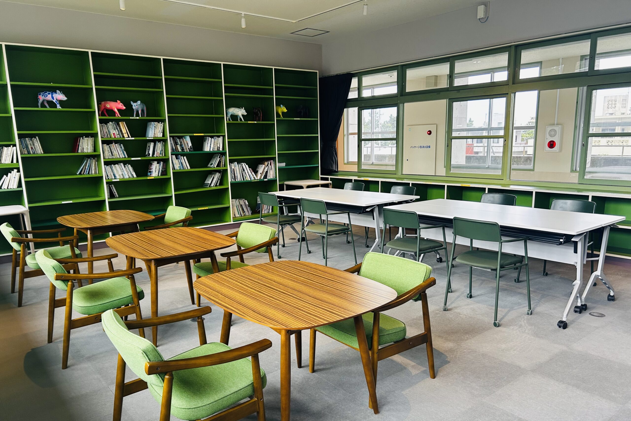 | 会議室 | ・利用時間:9:00~21:00 (2時間からご利用いただけます) ・設備:机、椅子、ホワイトボード ※上記の設備は、無料でご利用いただけます | 【2時間あたり】 ・室料:3,000円 (以降1時間ごとに1,500円) ・冷房料:400円 (以降1時間ごとに200円) ・プロジェクター:500円 (以降1時間ごとに250円) |